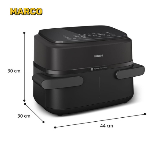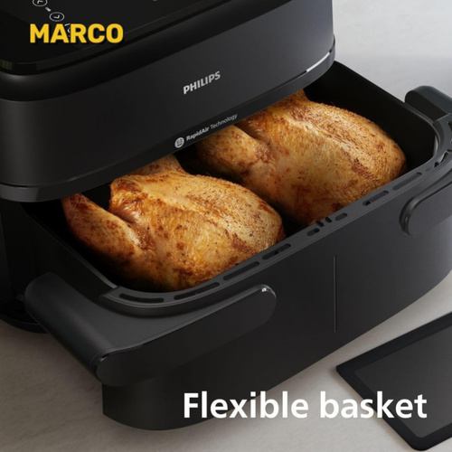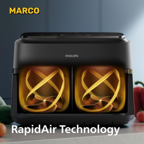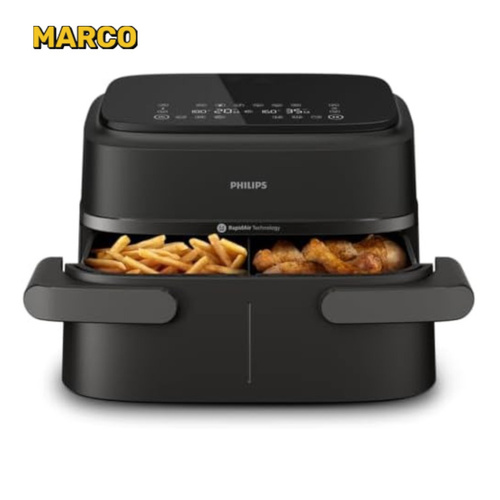 از آنجایی که این سرخ کن دارای دو محفظه پخت بوده می توان درون هر محفظه مواد غذایی یکسان یا متفاوت را قرار داده و آماده کرد. شما می توانید زمان های پخت را به طور خودکار در 2 کشو همگام سازی کنید تا هر دو غذای شما با هم آماده سرو شوند. هنگام آشپزی با این سرخ کن دو سبدی فیلیپس در مقایسه با فر سنتی، تا 40٪ سریع تر بپزید و تا 75٪ در مصرف انرژی صرفه جویی کنید. سیستم خاموش شدن خودکار موجب شده تا بعد از پخت غذا، دستگاه خاموش گردد و احتمال سوختن به شدت کاهش یابد.
